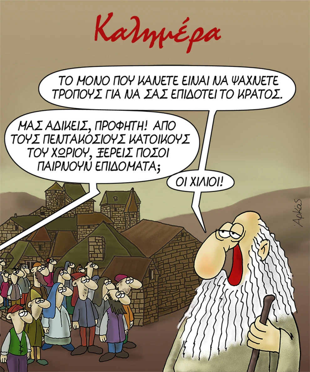 Ένας από αυτούς λοιπόν του απαντά: «Μας αδικείς προφήτη! Από τους πεντακόσιους κάτοικους του χωριού, ξέρεις πόσοι παίρνουν επιδόματα;».