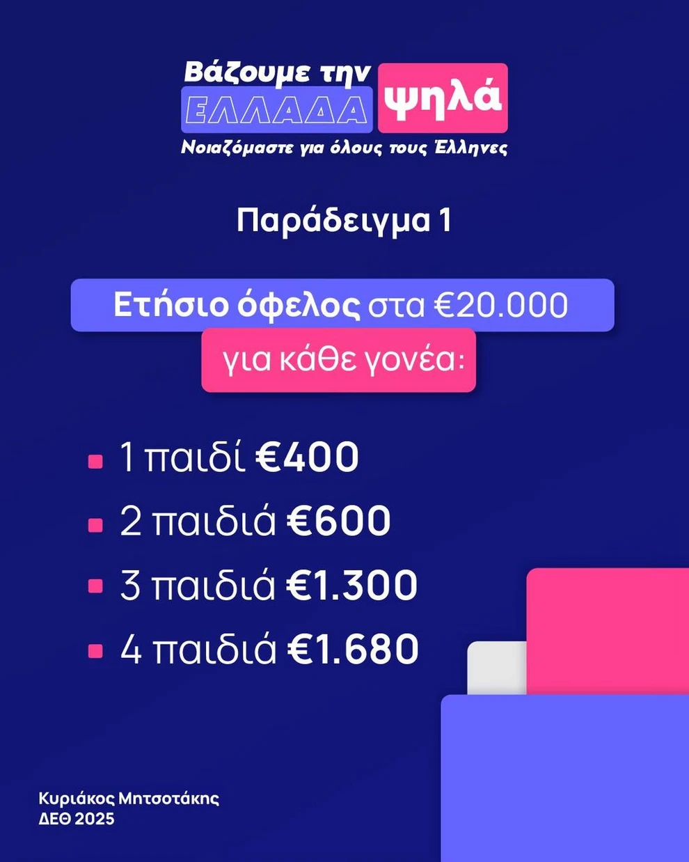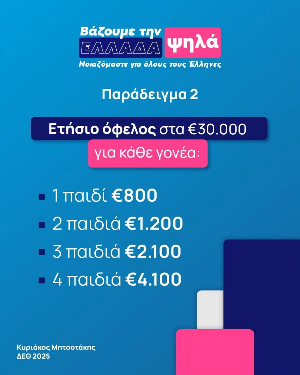 Το σχέδιο αυτό, όμως, έχει έντονο χρώμα δημογραφικό. Μεριμνά ουσιαστικά για την ελληνική οικογένεια, αναγνωρίζοντας ότι για ένα νοικοκυριό δεν είναι το ίδιο το κόστος του να μην έχεις παιδιά με το κόστος να μεγαλώνεις δύο ή τρία παιδιά.