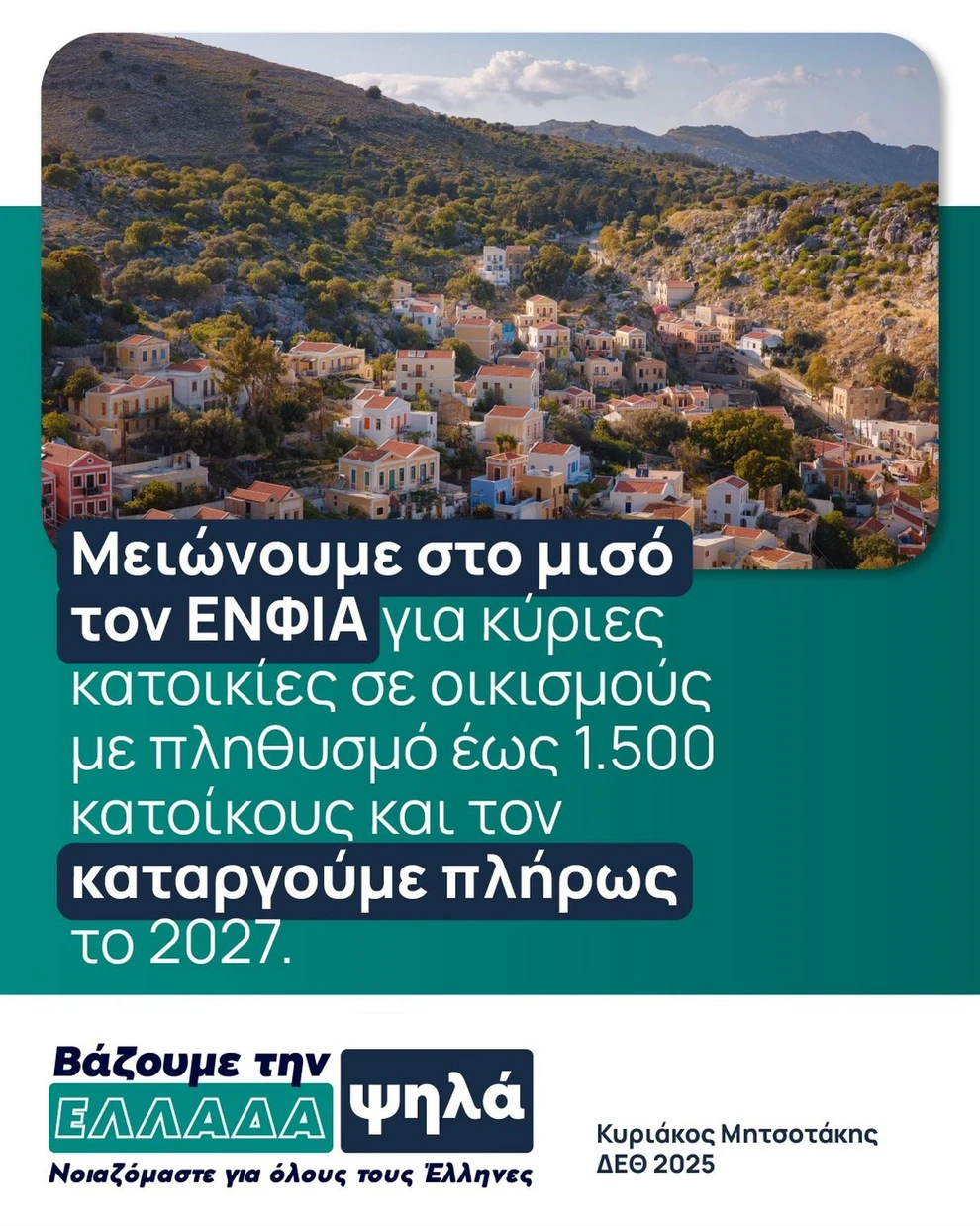 Από το 2026 ο ΕΝΦΙΑ μειώνεται στο μισό και το 2027 καταργείται εντελώς στις πρώτες κατοικίες χωριών κάτω από 1.500 κατοίκους. ΕΝΦΙΑ μηδέν σε δύο χρόνια από τώρα για όποιον έχει πρώτη κατοικία σε οποιοδήποτε ελληνικό χωριό, οπουδήποτε στη ελληνική επικράτεια.