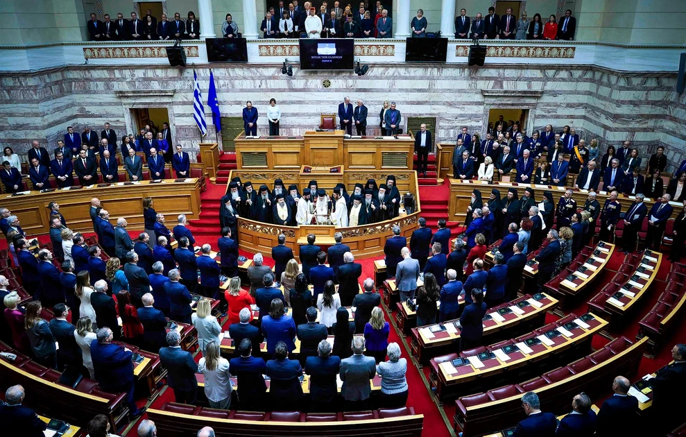 Ακολούθησε δοξολογία, με τον Κώστα Τασούλα να στέκεται δίπλα στον πρωθυπουργό, Κυριάκο Μητσοτάκη και τον πρόεδρο της Βουλής, Νικήτα Κακλαμάνη, δίπλα στα έδρανα του προεδρείου του Σώματος.