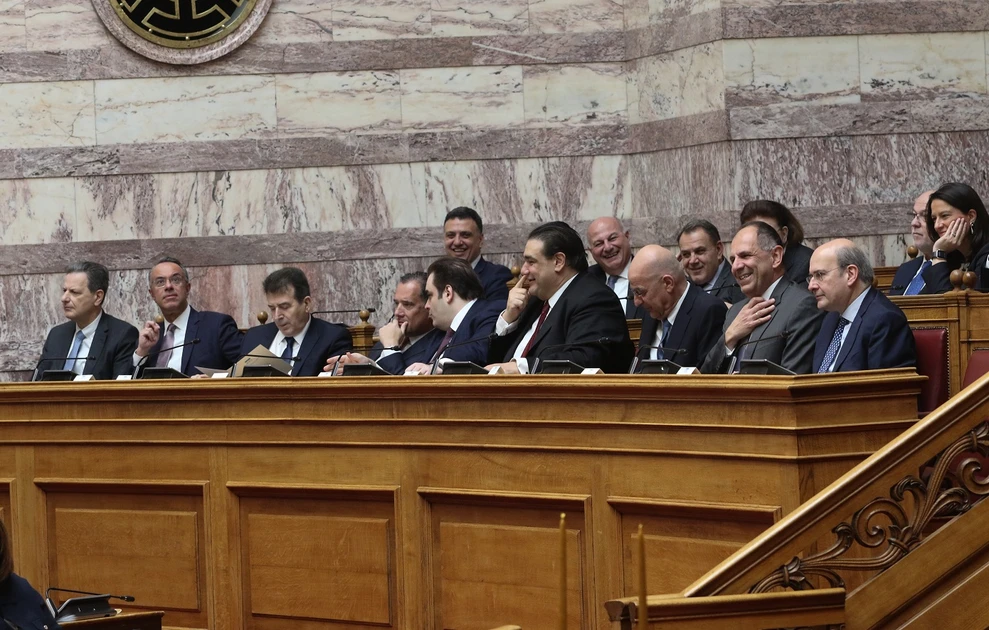 Στα πρώτα υπουργικά έδρανα, δίπλα από τον πρωθυπουργό, Κυριάκο Μητσοτάκη, κάθισε ο υπουργός Εθνικής Οικονομίας, Κωστής Χατζηδάκης και ακολούθησαν κατά σειρά, οι υπουργοί Γιώργος Γεραπετρίτης, Νίκος Δένδιας, Θόδωρος Λιβάνιος, Κυριάκος Πιερρακάκης, Άδωνις Γεωργιάδης, Μιχάλης Χρυσοχοΐδης, Χρήστος Σταϊκούρας και Θόδωρος Σκυλακάκης. Πιο πίσω πήραν θέση οι υπουργοί Τάκης Θεοδωρικάκος, Νίκη Κεραμέως, Γιώργος Φλωρίδης, Λίνα Μενδώνη, Νίκος Παναγιωτόπουλος, Βασίλης Κικίλιας, Όλγα Κεφαλογιάννη, ενώ στα τελευταία δύο έδρανα κάθισαν οι υφυπουργοί στον πρωθυπουργό Άκης Σκέρτσος και Γιώργος Μυλωνάκης.