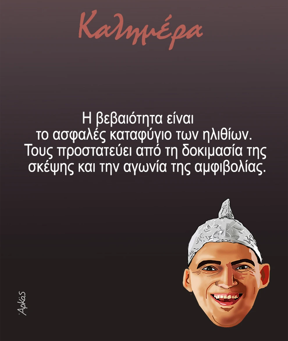 «Η βεβαιότητα είναι το ασφαλές καταφύγιο των ηλιθίων. Τους προστατεύει από τη δοκιμασία της σκέψης και την αγωνία της αμφιβολίας», γράφει ο Αρκάς στην επίσημη σελίδα του στο Facebook.