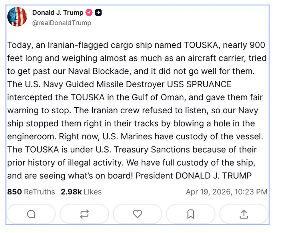 «Σήμερα, ένα φορτηγό πλοίο με ιρανική σημαία με το όνομα TOUSKA, μήκους σχεδόν 900 ποδιών και βάρους σχεδόν όσο ένα αεροπλανοφόρο, προσπάθησε να περάσει από τον Ναυτικό μας Αποκλεισμό, και δεν πήγε καλά γι’ αυτούς. Το αντιτορπιλικό USS SPRUANCE του Πολεμικού Ναυτικού των ΗΠΑ αναχαίτισε το TOUSKA στον Κόλπο του Ομάν και τους προειδοποίησε να σταματήσουν. Το ιρανικό πλήρωμα αρνήθηκε να ακούσει, οπότε το πλοίο του Πολεμικού Ναυτικού μας τους σταμάτησε αμέσως, ανοίγοντας μια τρύπα στο μηχανοστάσιο. Αυτή τη στιγμή, οι πεζοναύτες των ΗΠΑ έχουν την επιτήρηση του πλοίου. Το TOUSKA τελεί υπό κυρώσεις του Υπουργείου Οικονομικών των ΗΠΑ λόγω του προηγούμενου ιστορικού παράνομης δραστηριότητάς του. Έχουμε την πλήρη επιτήρηση του πλοίου και βλέπουμε τι υπάρχει πάνω του! Πρόεδρος ΝΤΟΝΑΛΝΤ ΤΖ. ΤΡΑΜΠ».