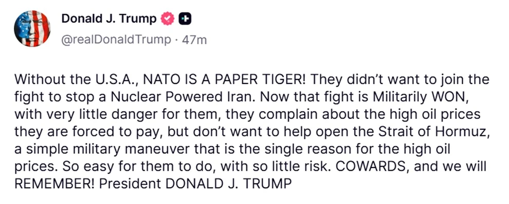 Σε ανάρτησή του στην πλατφόρμα Truth Social, ο πρόεδρος των ΗΠΑ υποστήριξε ότι είναι «τόσο εύκολο» για τα μέλη του ΝΑΤΟ να συμβάλουν στην επαναλειτουργία των Στενών του Ορμούζ, ωστόσο, όπως ανέφερε, δεν επιθυμούν να εμπλακούν σε έναν «απλό στρατιωτικό ελιγμό». Παράλληλα, τόνισε ότι η σύγκρουση με το Ιράν είναι «στρατιωτικά κερδισμένος» και ότι υπάρχει «πολύ μικρός κίνδυνος» για τη συμμαχία.