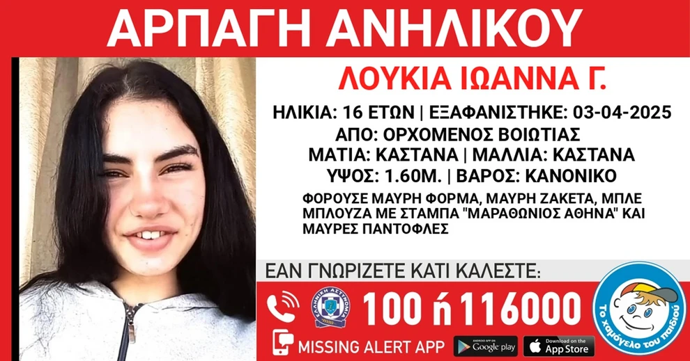 Πρόκειται για την 16χρονη, Λουκία Ιωάννα Γ. και η δημοσιοποίηση των στοιχείων της ανήλικης, έγινε κατόπιν εισαγγελικής εντολής, καθώς ενδεχομένως να εμπλέκονται τρίτα άτομα στην εξαφάνισή της που θέτουν τη ζωή της σε κίνδυνο.