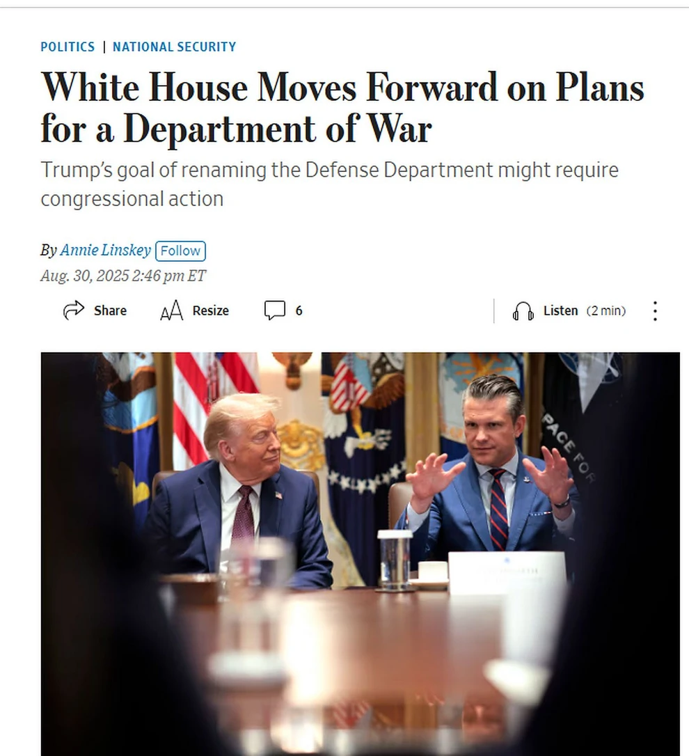 WSJ: Η κυβέρνηση Τραμπ σχεδιάζει να μετονομάσει το υπουργείο Άμυνας σε υπουργείο Πολέμου