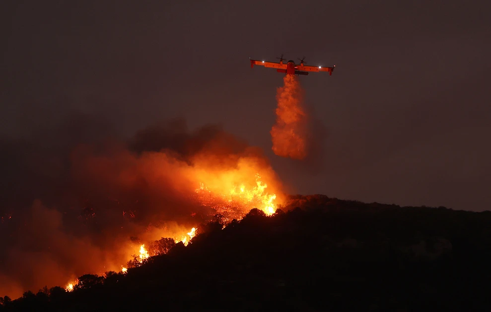 Με τα φώτα πτήσης αναμμένα, για να διακρίνονται μεταξύ τους μέσα στον πυκνό καπνό, τα πληρώματα των αεροσκαφών πραγματοποίησαν τις τελευταίες ρίψεις νερού στο σκοτάδι, σε μια προσπάθεια να επιβραδύνουν την εξάπλωση της φωτιάς.